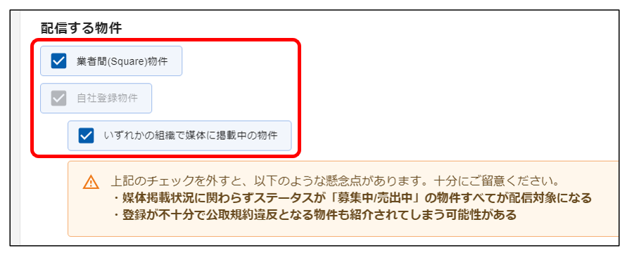「いずれかの組織で媒体に掲載されている物件を紹介する」のチェックを外す際には、