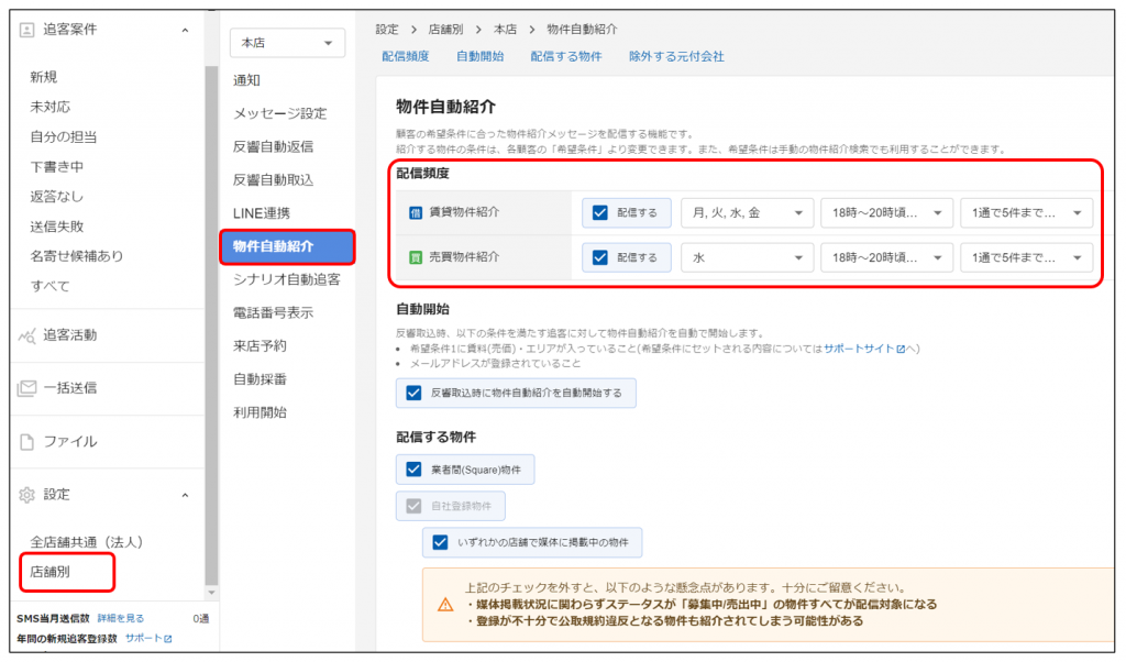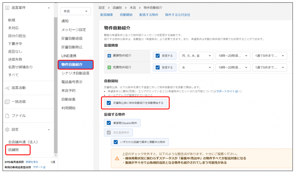 「反響取込時に物件自動紹介を自動開始する」にチェックを入れると
