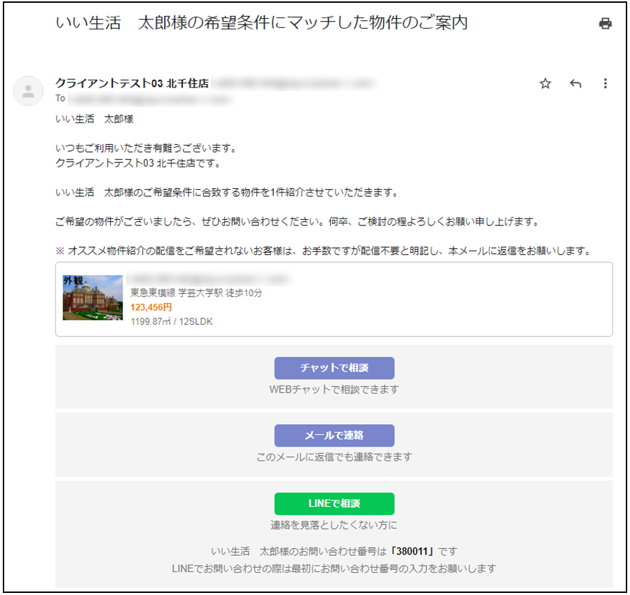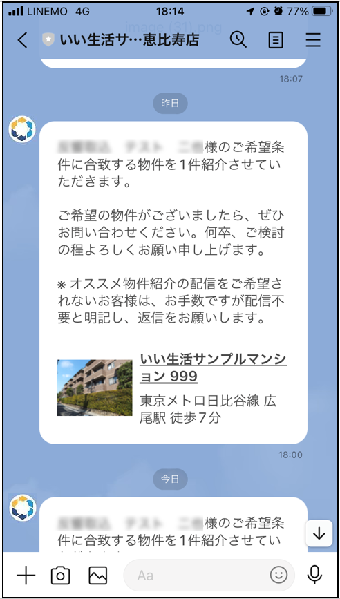 その日の9~11時頃の配信タイミングから物件紹介が送信される。