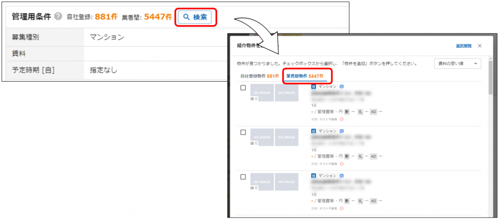 自社登録物件だけでなく、Oneネットワークに公開されている業者間物件も紹介することができます。