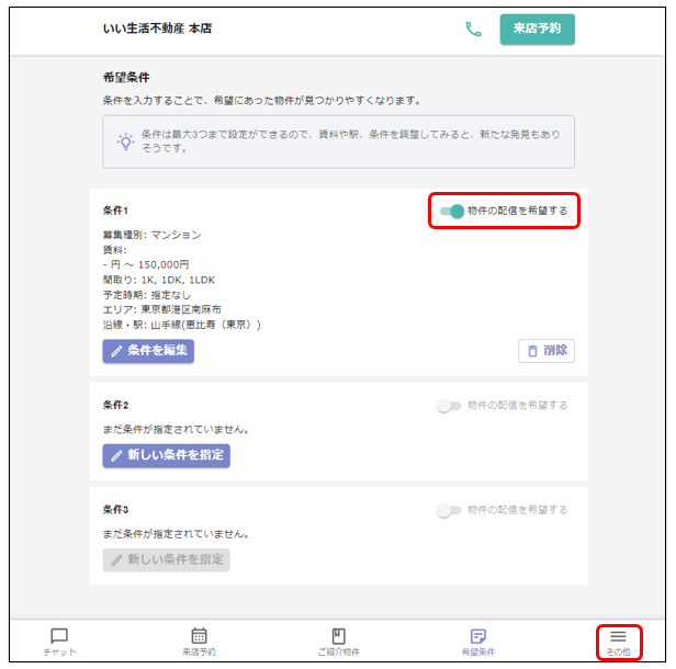希望条件1〜3に該当する物件自動紹介配信のみ停止することができます。