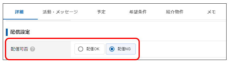 追客案件の詳細画面にある「配信設定」から配信可否を変更してください。