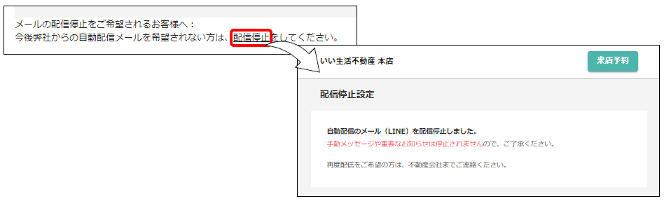 物件自動紹介メール(LINE)の末尾に表示されている「配信停止」のリンクをクリックすると配信停止の設定になります。