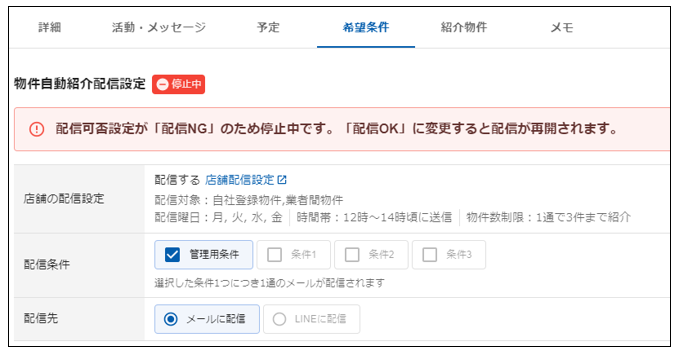 配信停止になった場合、追客案件詳細の希望条件に配信停止中の旨が表示されます。