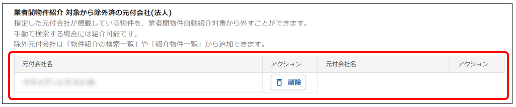 除外済みの元付会社はメニュー>設定の、各組織の設定画面に表示されます。
