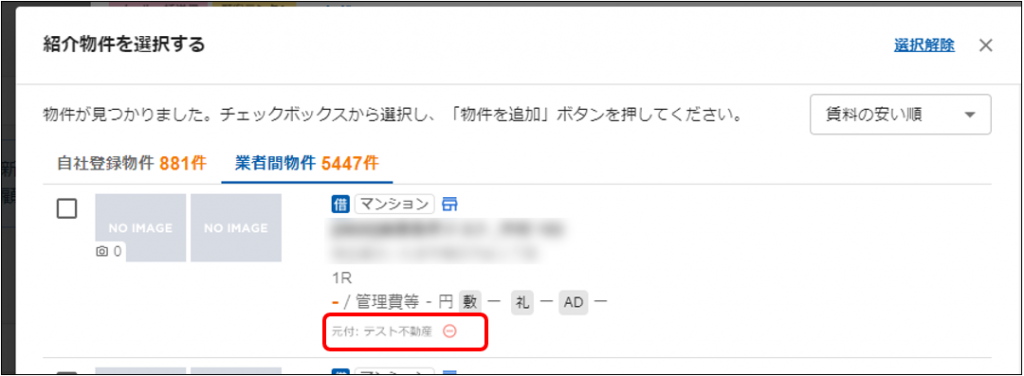 送信対象外にしたい物件がある場合、元付会社名をクリックすると配信対象から除外できます。