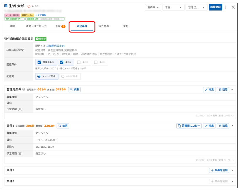 お客様ごとに希望条件登録と配信設定を行う手順をご紹介します。
