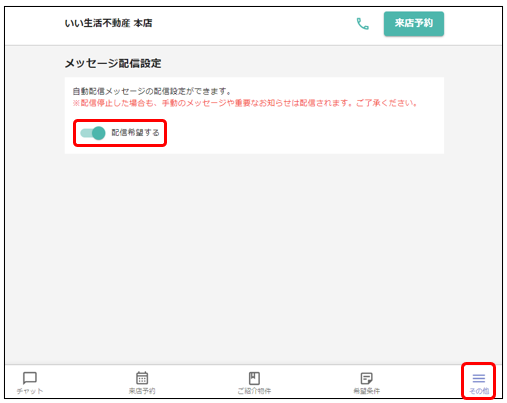 設定箇所:顧客マイページ>希望条件>物件の配信を希望する