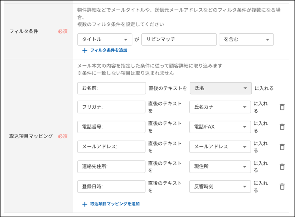 | 取込項目マッピング | 「お名前: 」直後のテキストを「氏名」に入れる 「フリガナ: 」直後のテキストを「氏名カナ」に入れる 「電話番号: 」直後のテキストを「電話/FAX」に入れる 「メールアドレス: 」直後のテキストを「メールアドレス」に入れる 「連絡先住所: 」直後のテキストを「現住所」に入れる 「登録日時: 」直後のテキストを「反響時刻」に入れる ※項目名とコロン(:)の間のスペースもそのままコピーし入力してください。 |