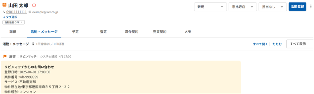 本ページでは、追客種別「売」の「リビンマッチ」のカスタムメール取込を利用した