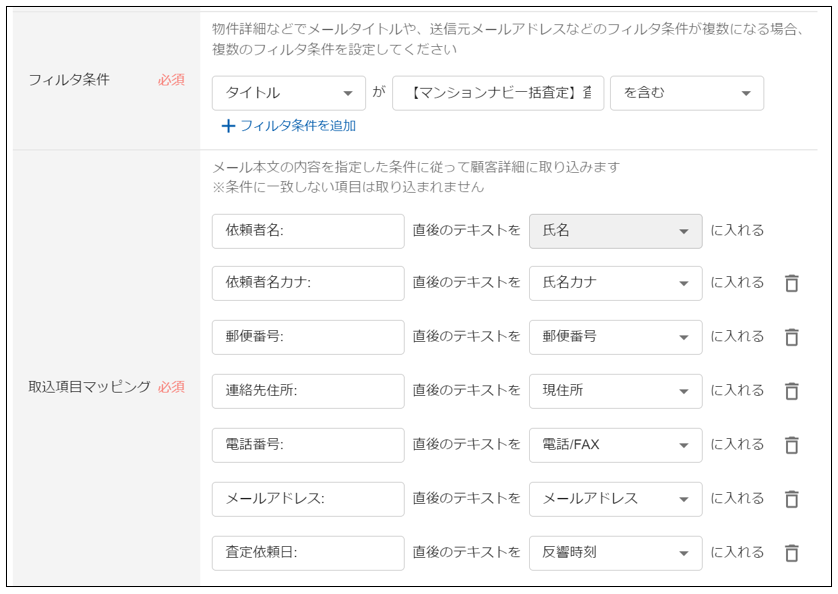 | 取込項目マッピング | 「依頼者名: 」直後のテキストを「氏名」に入れる 「依頼者名カナ: 」直後のテキストを「氏名カナ」に入れる 「郵便番号: 」直後のテキストを「郵便番号」に入れる 「連絡先住所: 」直後のテキストを「現住所」に入れる 「電話番号: 」直後のテキストを「電話/FAX」に入れる 「メールアドレス: 」直後のテキストを「メールアドレス」に入れる 「査定依頼日: 」直後のテキストを「反響時刻」に入れる ※コロン(:)の後の半角スペースもそのままコピーし入力してください。 |
