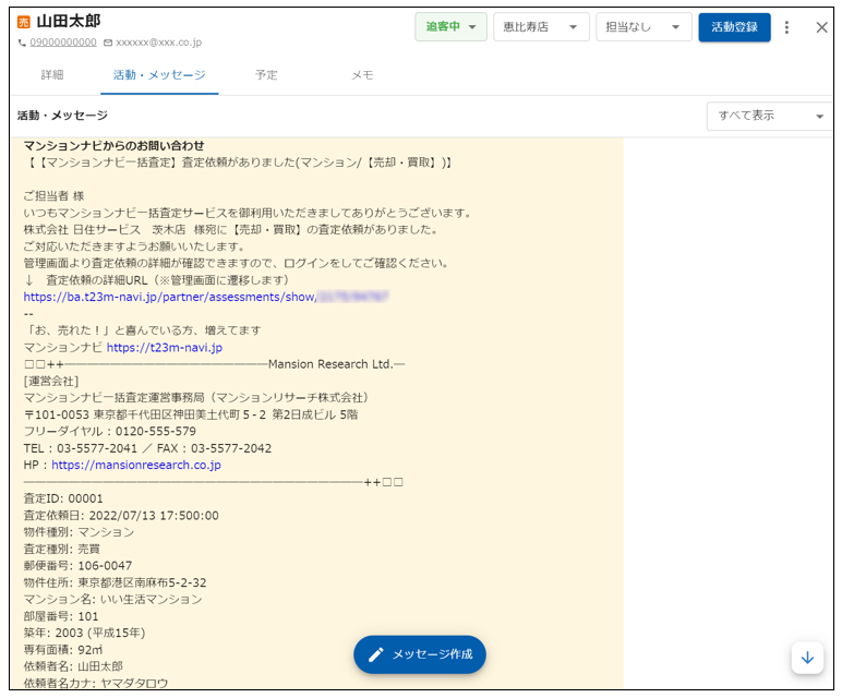 本ページでは、追客種別「売」の「マンションナビ」のカスタムメール取込を利用した