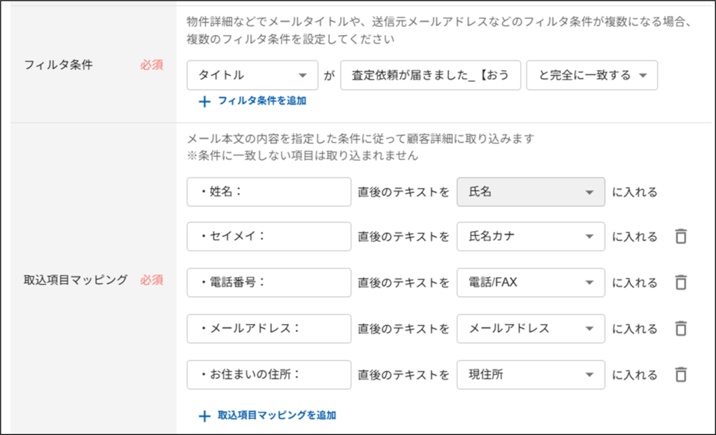 | 取込項目マッピング | 「・姓名: 」直後のテキストを「氏名」に入れる 「・セイメイ: 」直後のテキストを「氏名カナ」に入れる 「・電話番号: 」直後のテキストを「電話/FAX」に入れる 「・メールアドレス: 」直後のテキストを「メールアドレス」に入れる 「・お住まいの住所: 」直後のテキストを「現住所」に入れる ※コロン(:)前後の半角スペースもそのままコピーし入力してください。 |