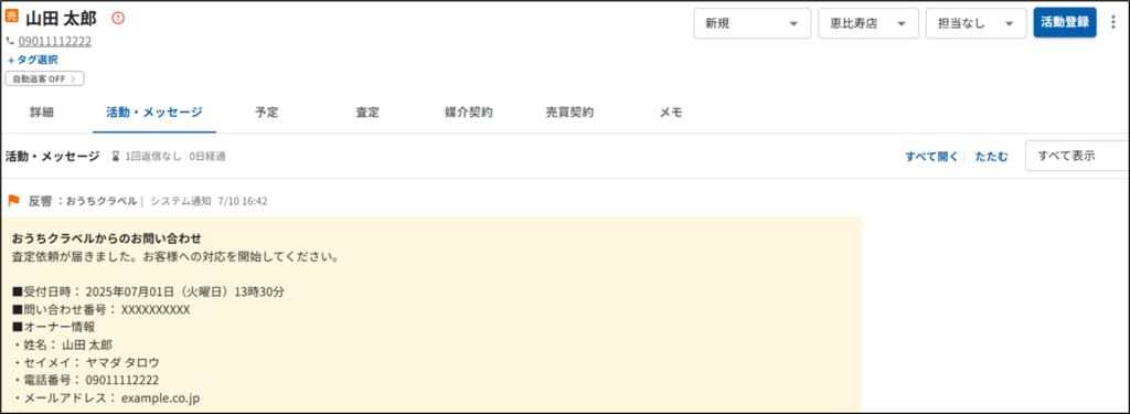 本ページでは、追客種別「売」の「おうちクラベル」のカスタムメール取込を利用した