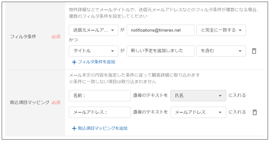 | フィルタ条件 | 「送信元メールアドレス」が「notifications@timerex.net」「と完全に一致する」 かつ 「タイトル」が「新しい予定を追加しました」「を含む」 |