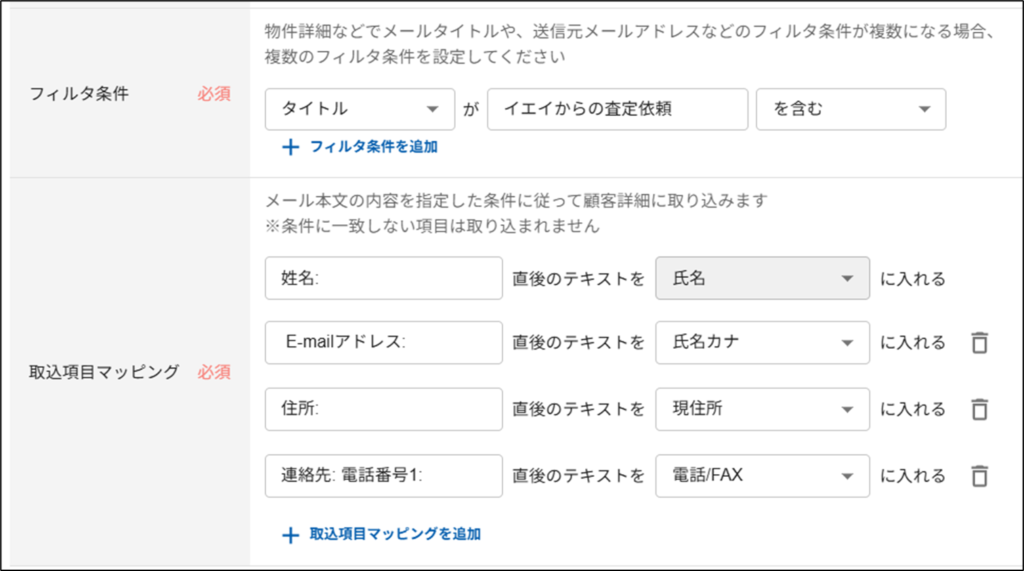 ・本設定は、個人情報をメールに記載して転送するサービスを併用して、反響取込する場合の設定となっております。