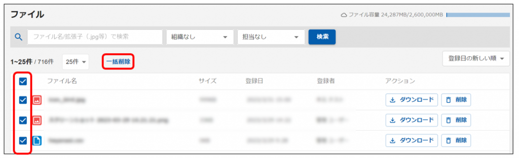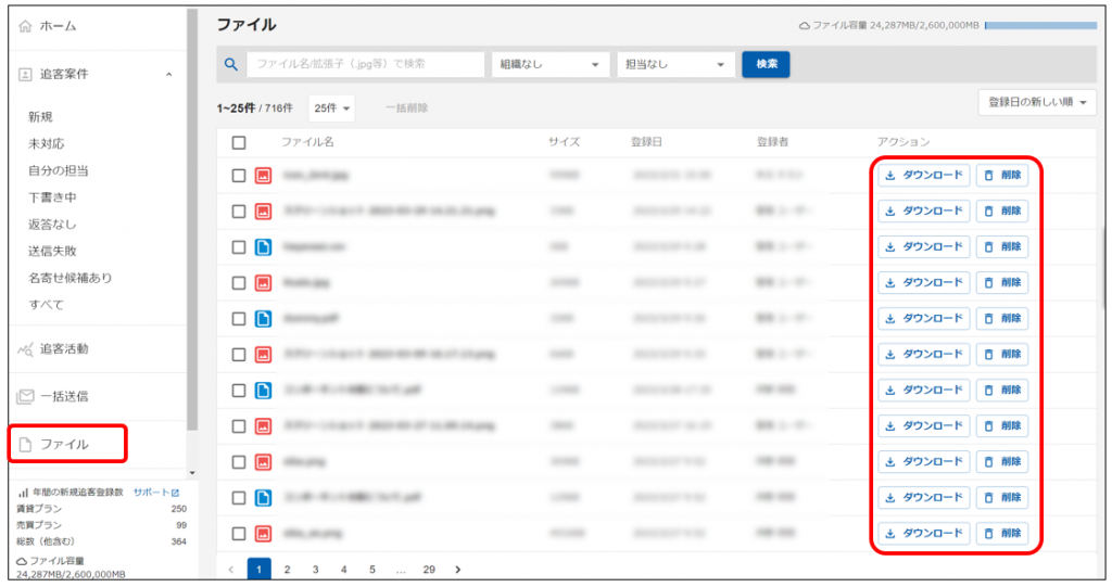 「ファイル」では、アップロードした画像の削除やダウンロードが可能です。主にファイル容量を減らしたい時にご活用ください。