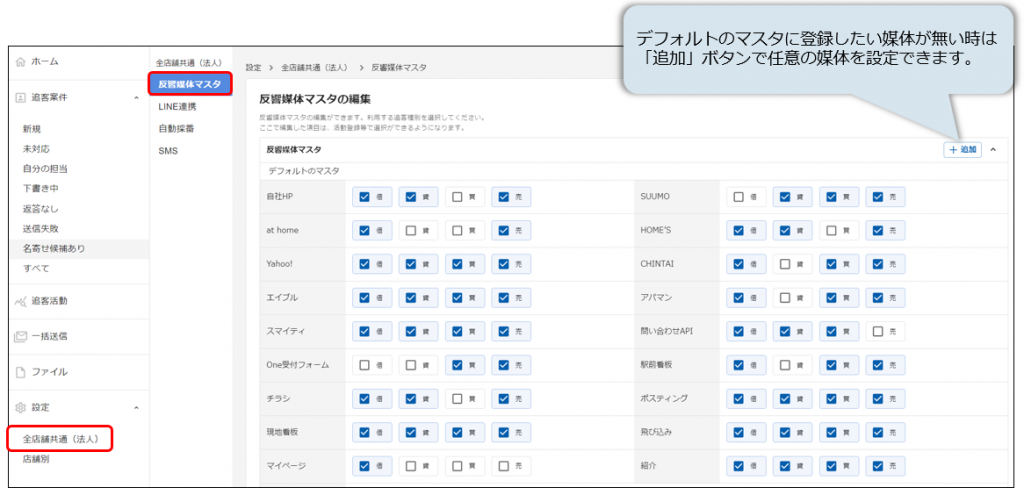 全組織共通(法人)設定の「反響媒体マスタの編集」で必要な媒体に対し、「借・貸・買・売」のうち必要な種別だけを選択してください。例えば借のみを選択した媒体は、借顧客の活動登録の時にだけ表示されます。