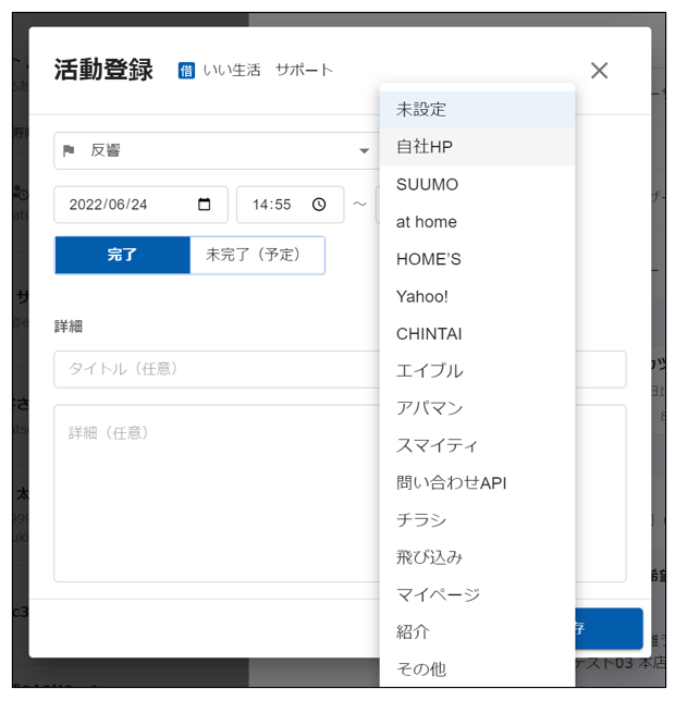 活動登録のアクション種別が「反響」の時、選択肢として表示される媒体の設定のことです。