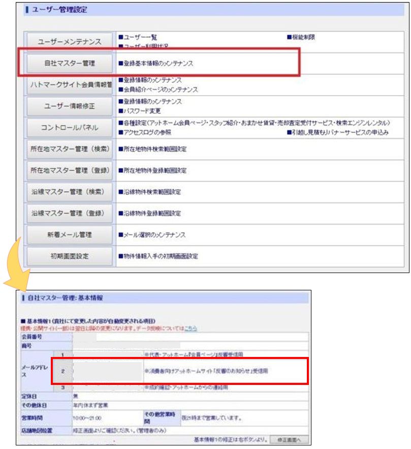 「消費者向けアットホームサイト「反響のお知らせ」受信?」に「媒体設定用アドレス」を登録します。