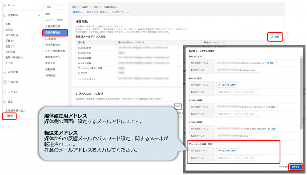 本ページでは、アットホーム(賃貸・売買)の反響取込を開始するまでの設定手順をご案内いたします。