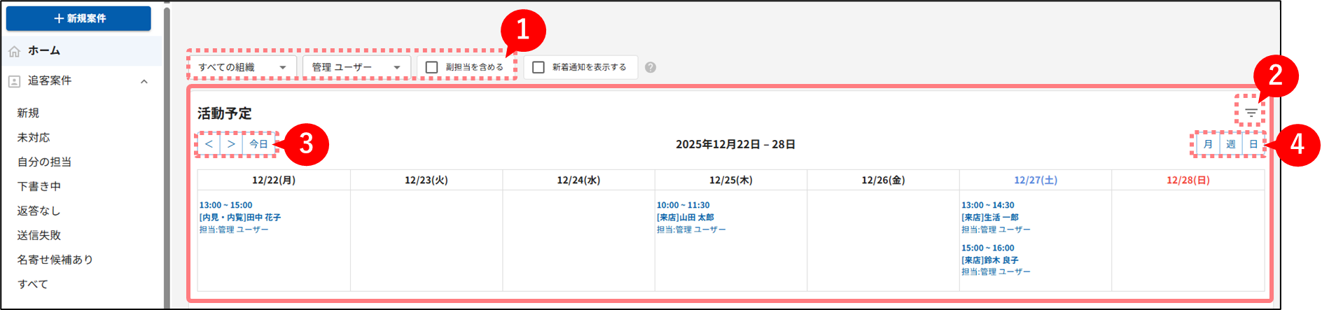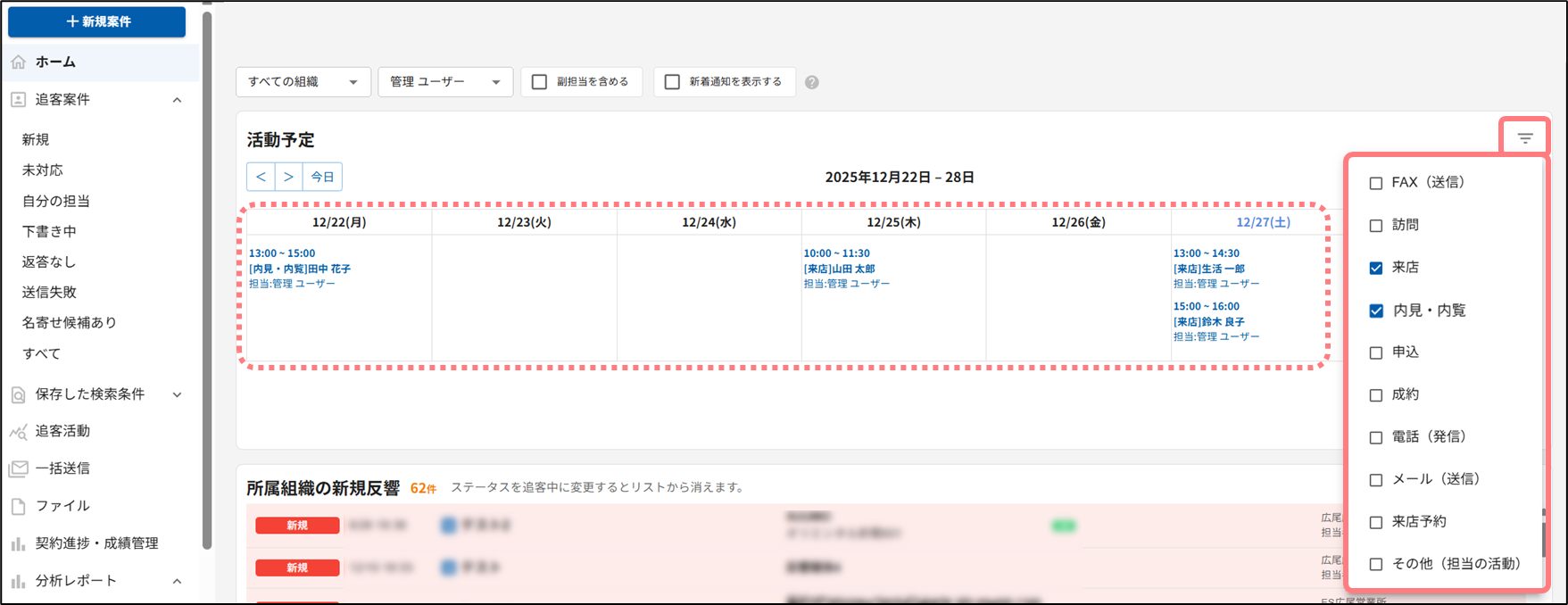 追客案件の担当組織・担当者を指定して、表示される活動予定を切り替えられます。