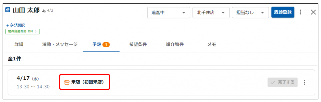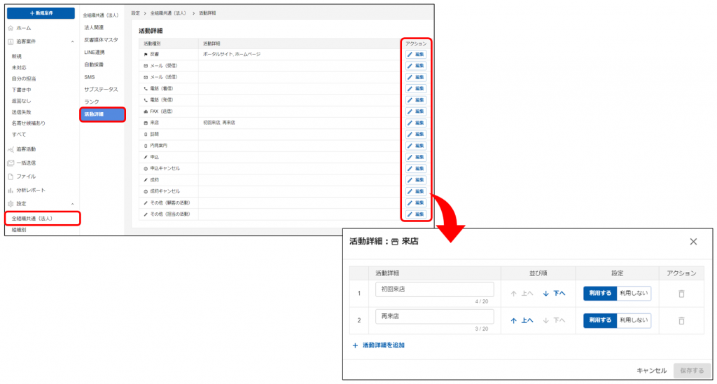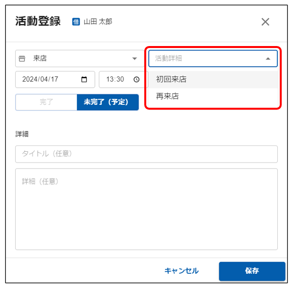 ・「活動種別:来店」 → 「活動詳細:初回来店、再来店」など