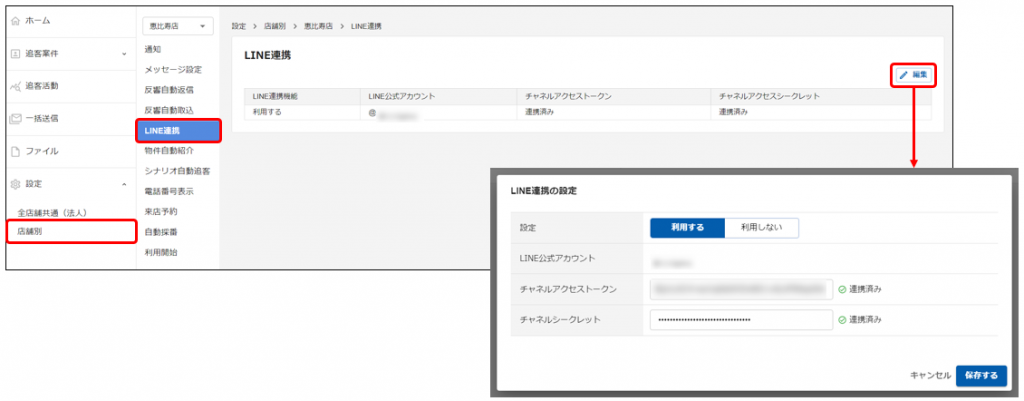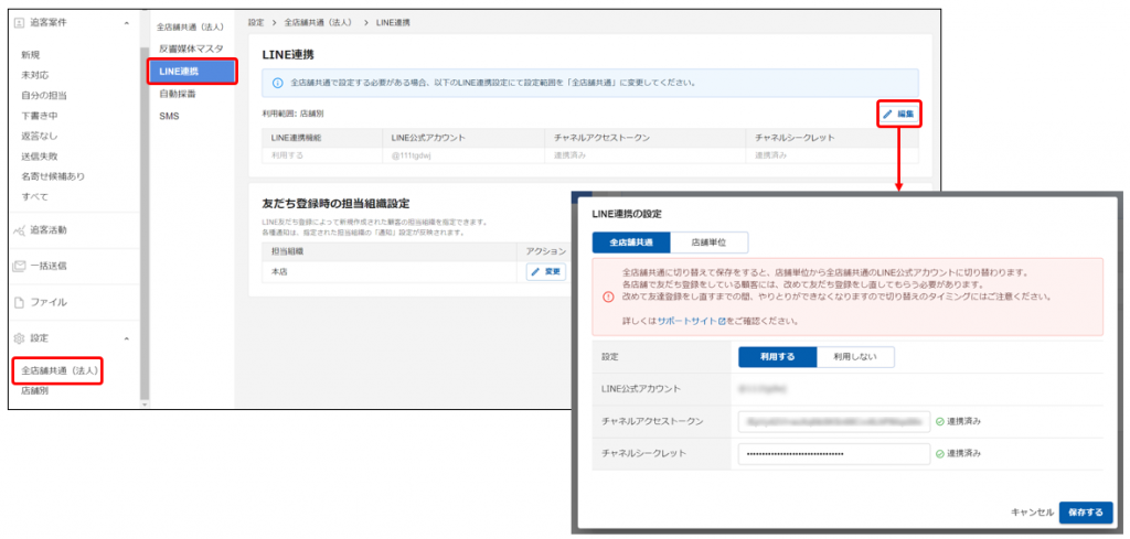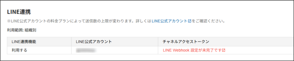 LINE連携を始める場合は、全組織共通(法人)または組織のLINE連携設定の編集画面で