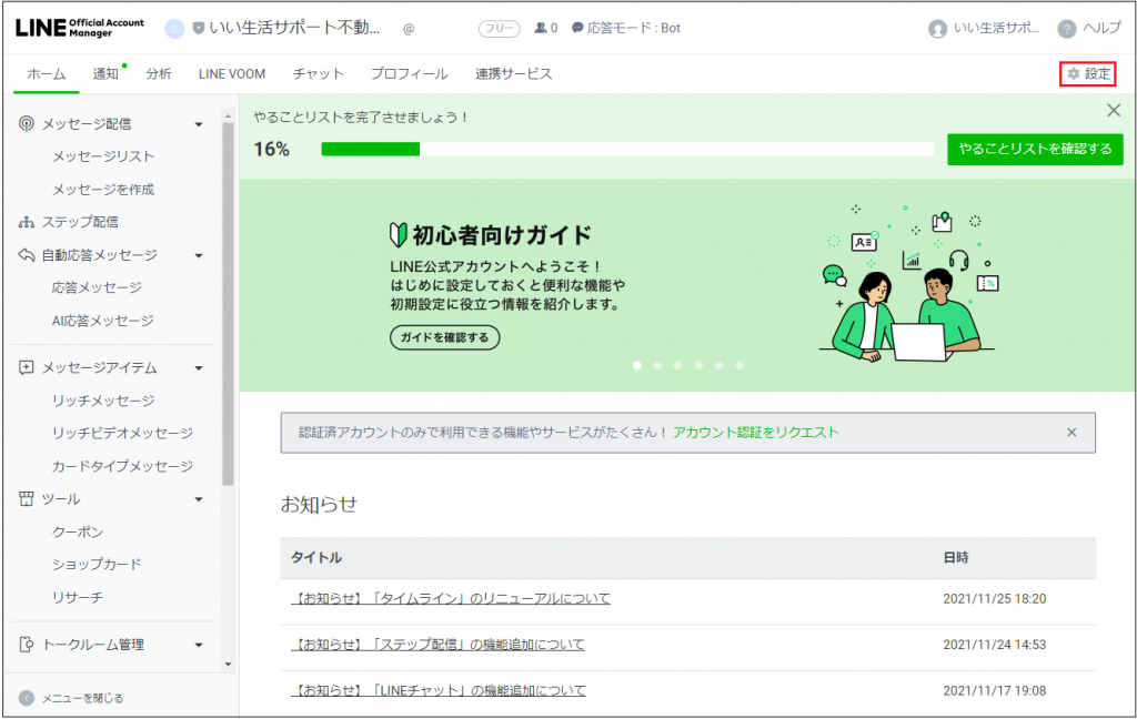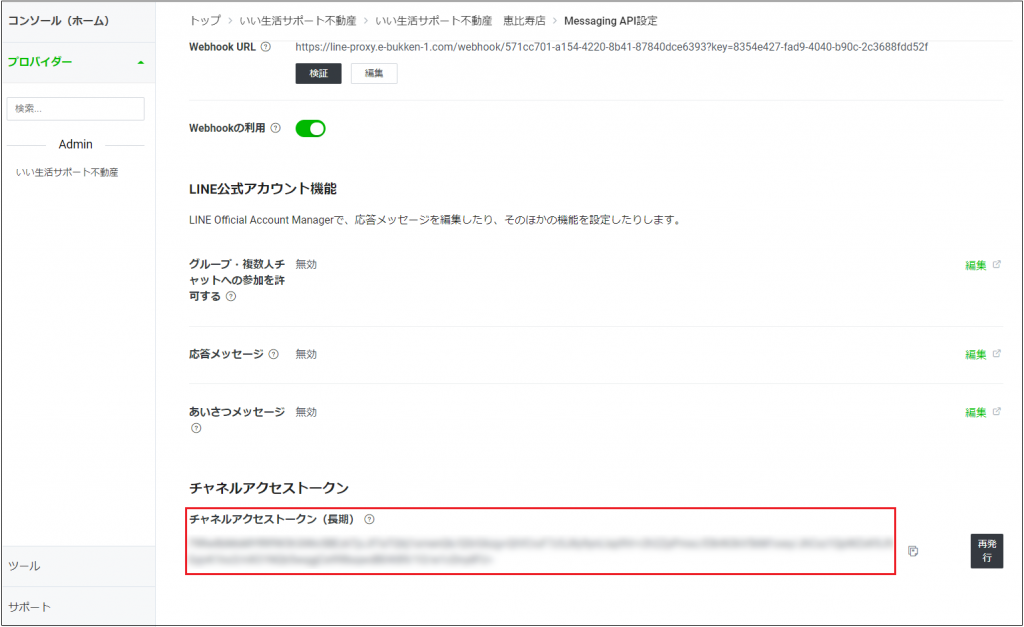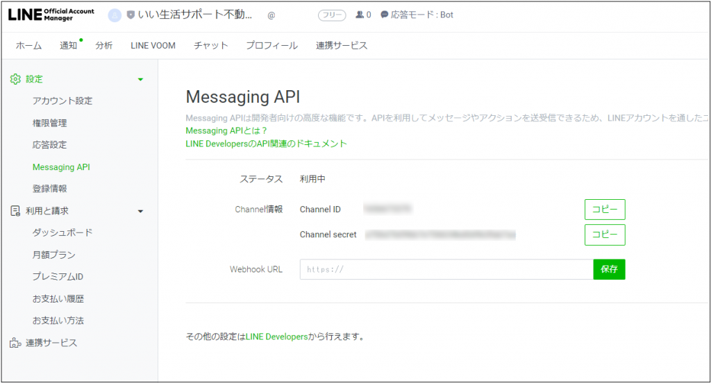 ※LINE公式アカウントで 「チャネルアクセストークン」「チャネルシークレット」 の発行が出来ていない場合は