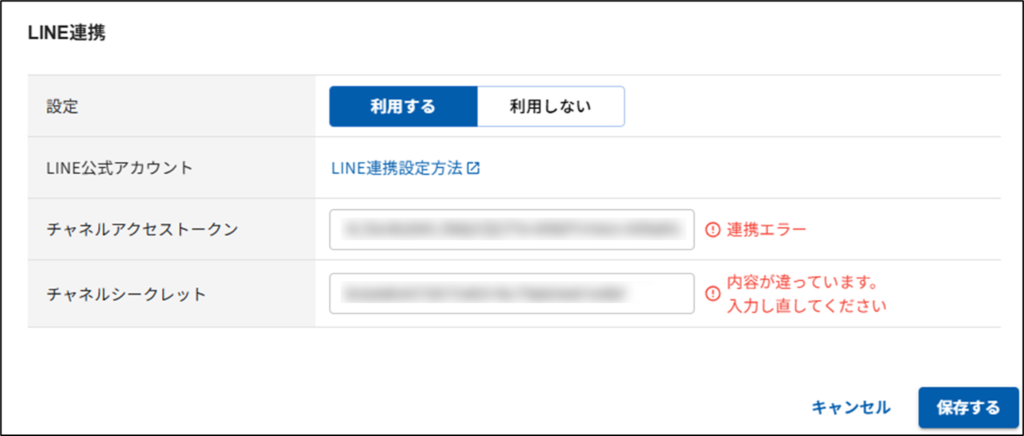 ・「チャネルアクセストークン」「チャネルシークレット」を入力し、「利用する」に切り替えると