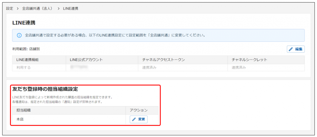 ・全組織共通(法人)設定の場合は、「友だち登録時の担当組織設定」も設定してください。