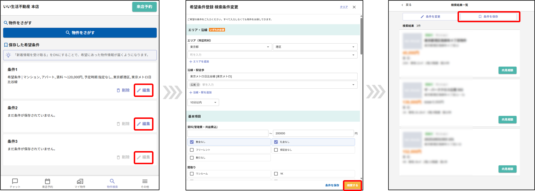 お客様は物件情報の確認や物件のお気に入り登録、内見相談を申し込むことができます。