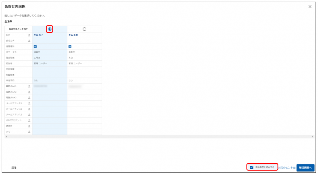 4. 名寄せ先選択画面では、情報を残したいものを選択し、確認画面へ進みます。