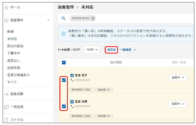 同じお客様に対して重複して作成された追客案件をひとつにまとめるのが「名寄せ」機能です。