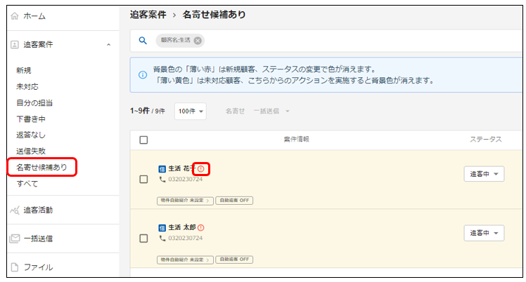 お客様の情報が以下のいずれかの条件を満たす場合、左メニューの「名寄せ候補あり」に表示されます。
