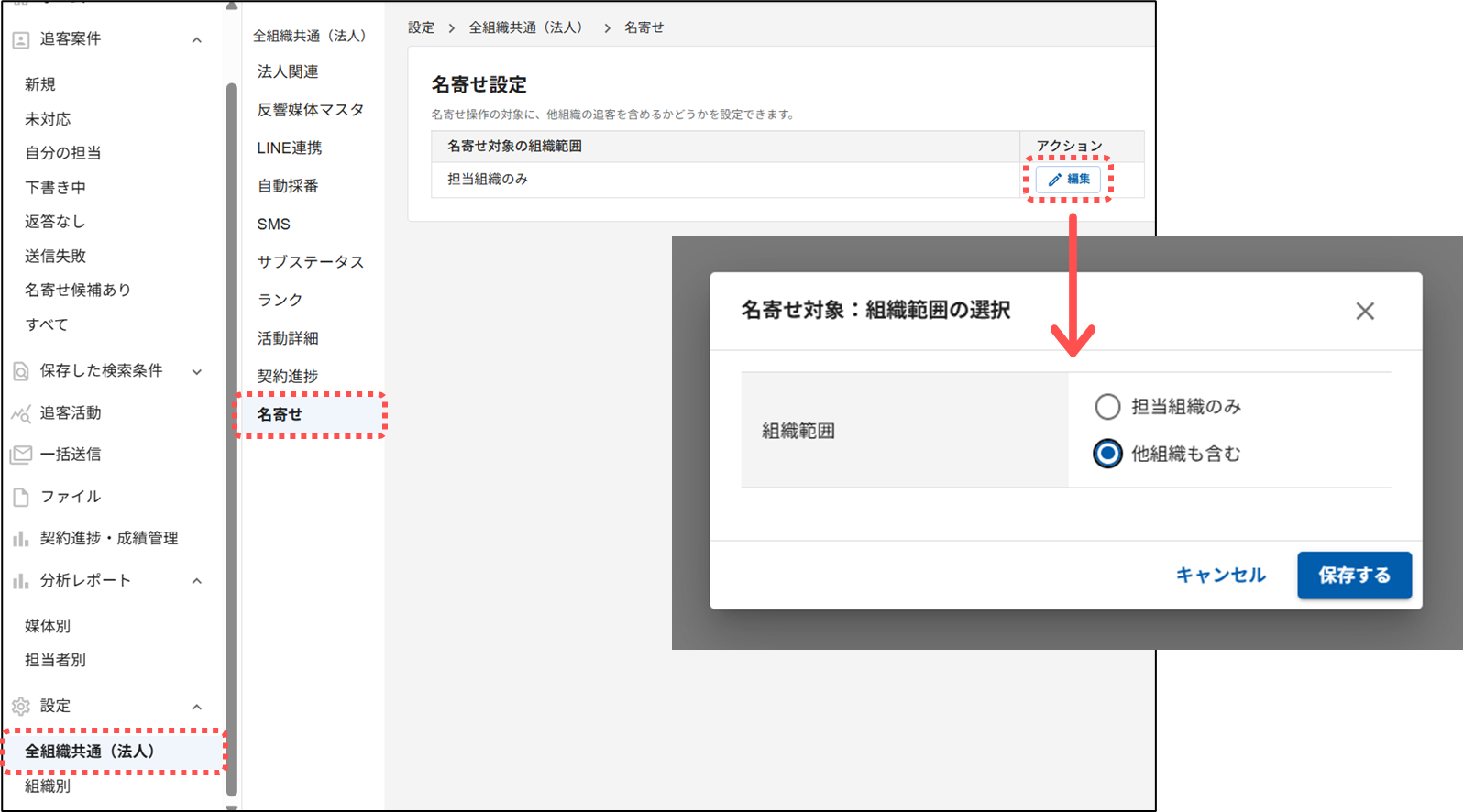 ※LINE連携済みの顧客を名寄せする場合、追客案件の担当組織が同一である必要がございます。