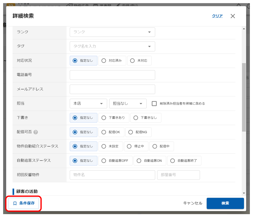 追客案件の検索欄、もしくは詳細検索の画面で「条件保存」をクリックし、 「検索条件の保存」画面で任意の名前をつけて保存してください。