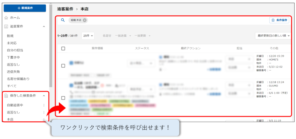 追客案件の検索条件を保存して、画面左のメニューからすぐに呼び出すことができます。