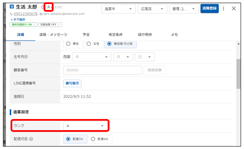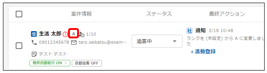 付与したランクは追客案件上部と追客案件一覧に表示されます。