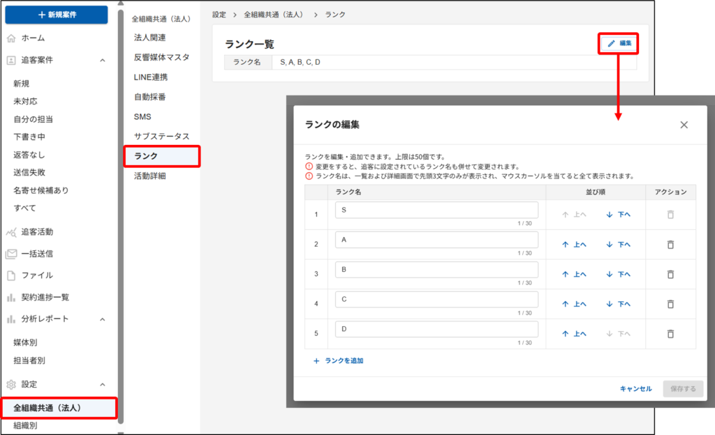 ・ランク名を変更すると追客に設定済みのランク名も変更されます。
