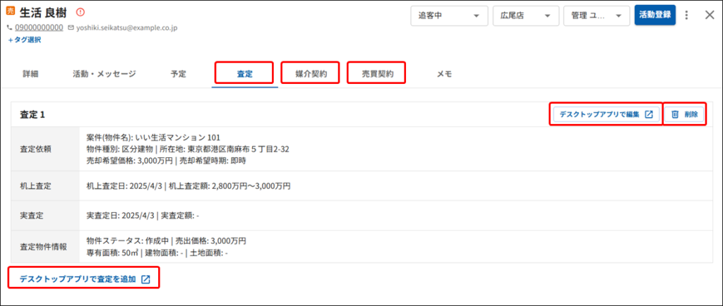 対象画面:追客案件>査定タブ、媒介契約タブ、売買契約タブ