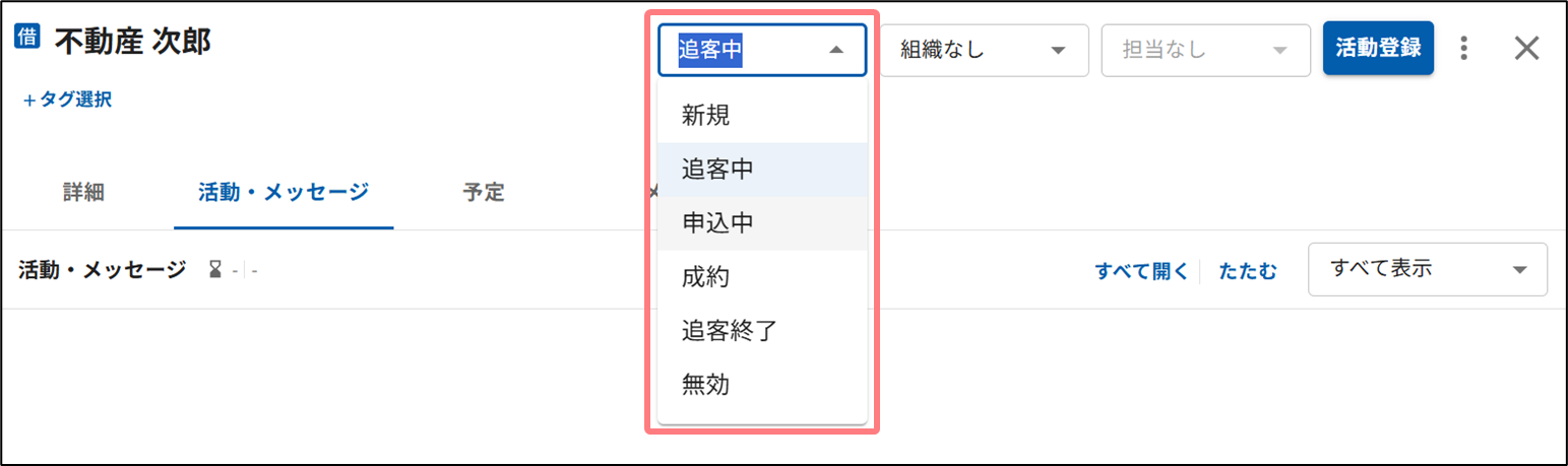 申込中 | 契約が申込中となった際に選択します。 契約種別「借」の追客案件については 契約進捗・成績管理機能を利用できるようになります。 |