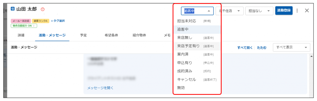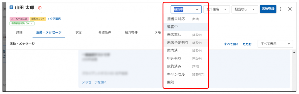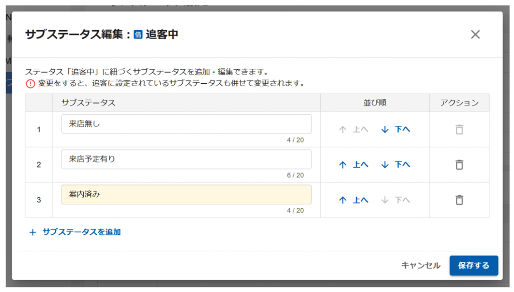 3.追客案件一覧・詳細のステータス一覧にサブステータスが表示されるようになるので設定します。