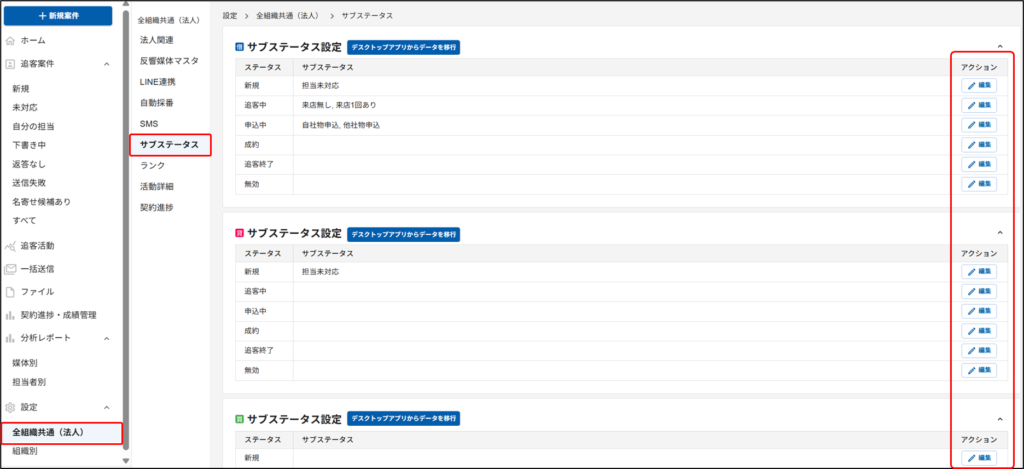 デスクトップアプリと同名称のサブステータスを『クラウド営業支援』に予め登録していただく必要があります。