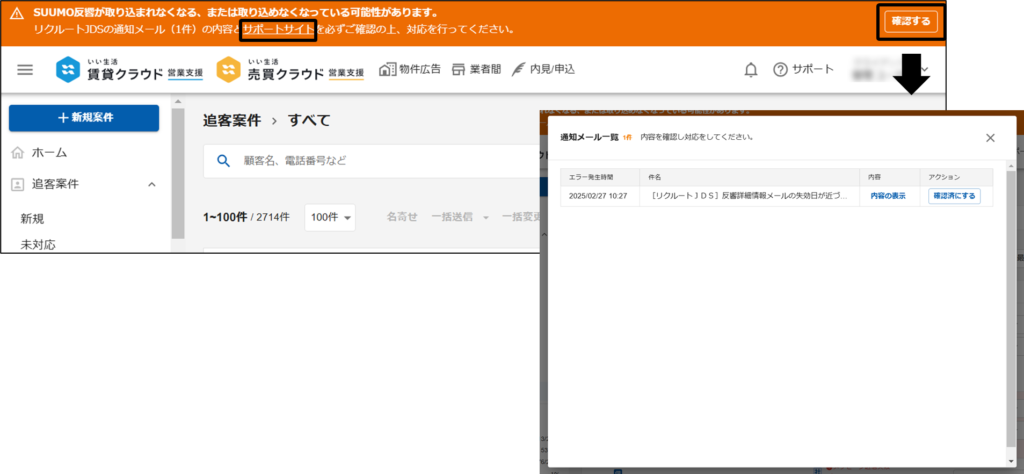 クラウド営業支援の画面上部にオレンジ色の帯でSUUMO反響取込アラートが表示されている場合は