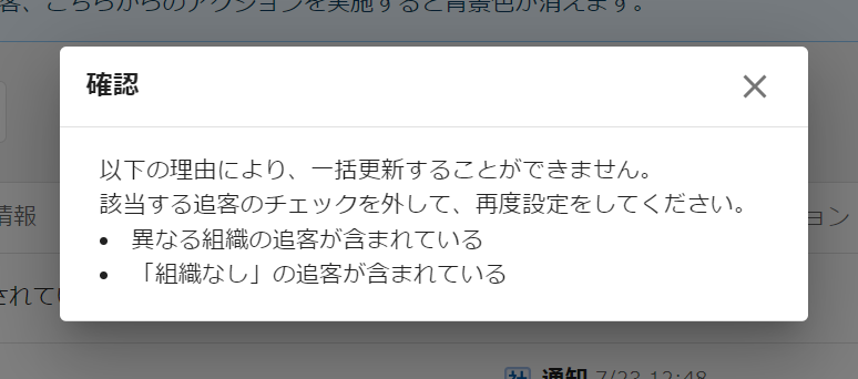 選択した追客案件に異なる組織の追客や「組織なし」の追客が含まれていると、一括更新ができません。