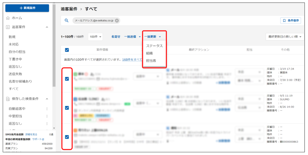 追客案件の「担当組織」「担当者」「ステータス」は一括更新が可能です。