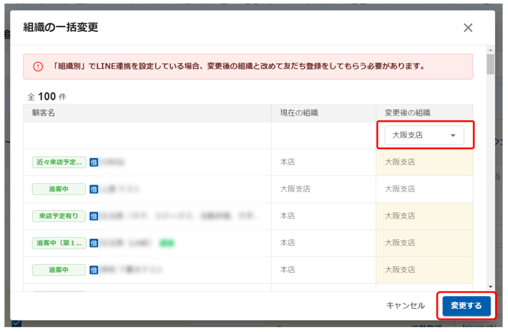 「変更後の組織」を選択して「変更する」をクリックすると組織が一括変更されます。