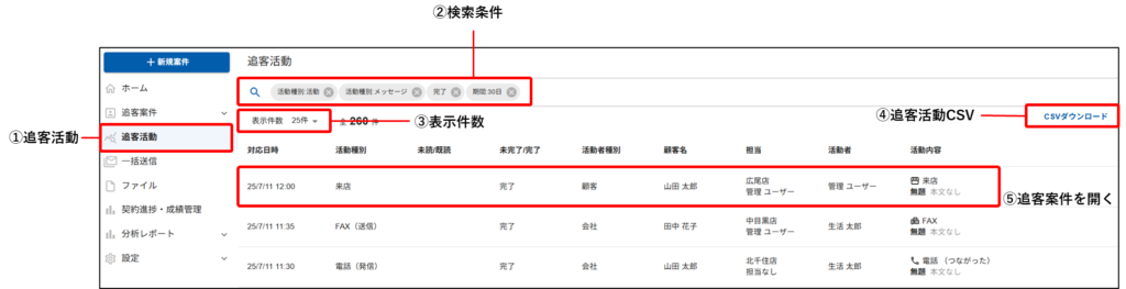 | ②検索条件 | 顧客種別や顧客名、期間等で活動を絞り込み表示することができます。 |