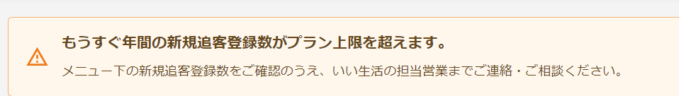 また、新規追客登録数がプラン上限の80%に達した際には以下のようにアラートを表示します。